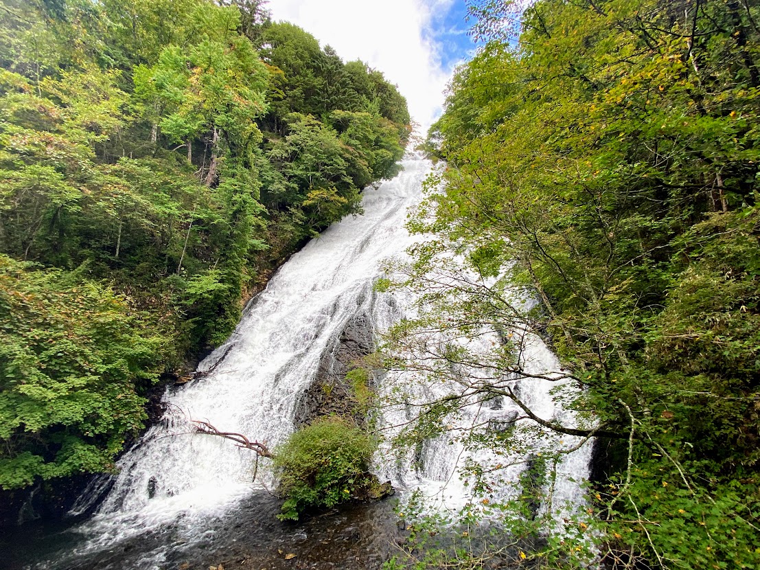 写真だけ見るとかなり山深いところに見えるのですが、実は渓流のすぐ近くに車道が通っているので、気軽に渓流の美しい眺めを楽しむことができます。