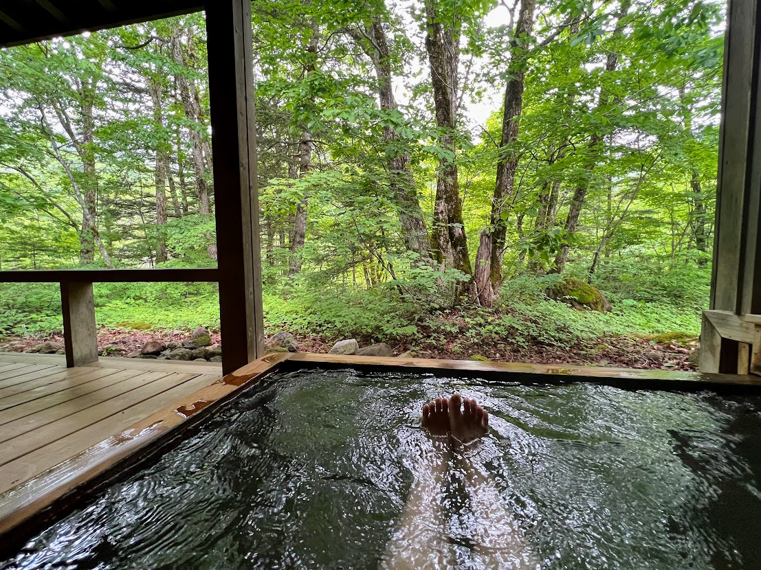 平湯温泉バスターミナルから徒歩6分の場所とは思えない、原生林に囲まれた場所にあり、森の中での湯浴みを楽しめます。お湯も極上です。