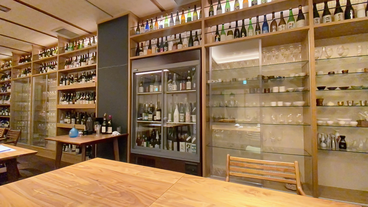 壁一面にお酒のボトルとさまざまな酒器が並んでいます。眺めているだけで楽しいですね。
