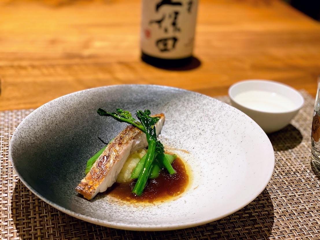 柏崎で水揚げされた真鯛のポワレを赤ワインのソースで。