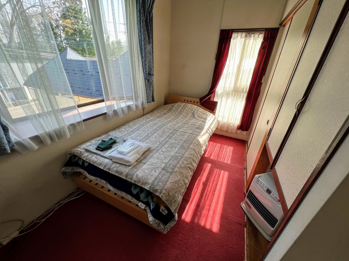 私が宿泊したのはバストイレ無しの洋室で、畳ベッドが2台設置してありました。1名宿泊の場合は布団は1組しか敷かれていないので、和洋室的に使えますね。この価格帯の宿だと「布団敷きは自分で」ということも多いですが、ベッドルームなのでお布団敷いてあるのも楽で良し。寝具もきれいです。