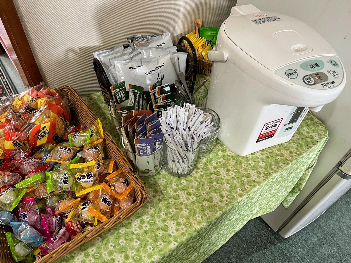 湯わかしポットは部屋にはありませんが、廊下に共同のものが設置されており、紅茶とインスタントコーヒーも自由に飲めます。