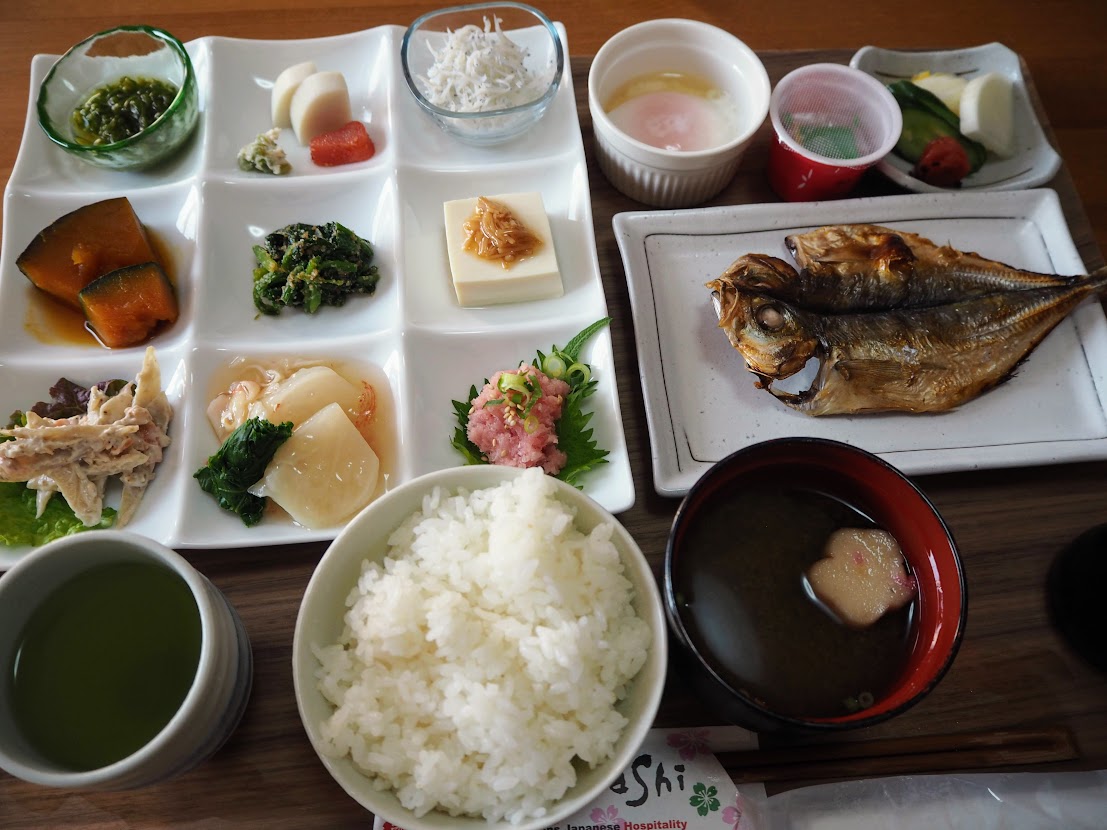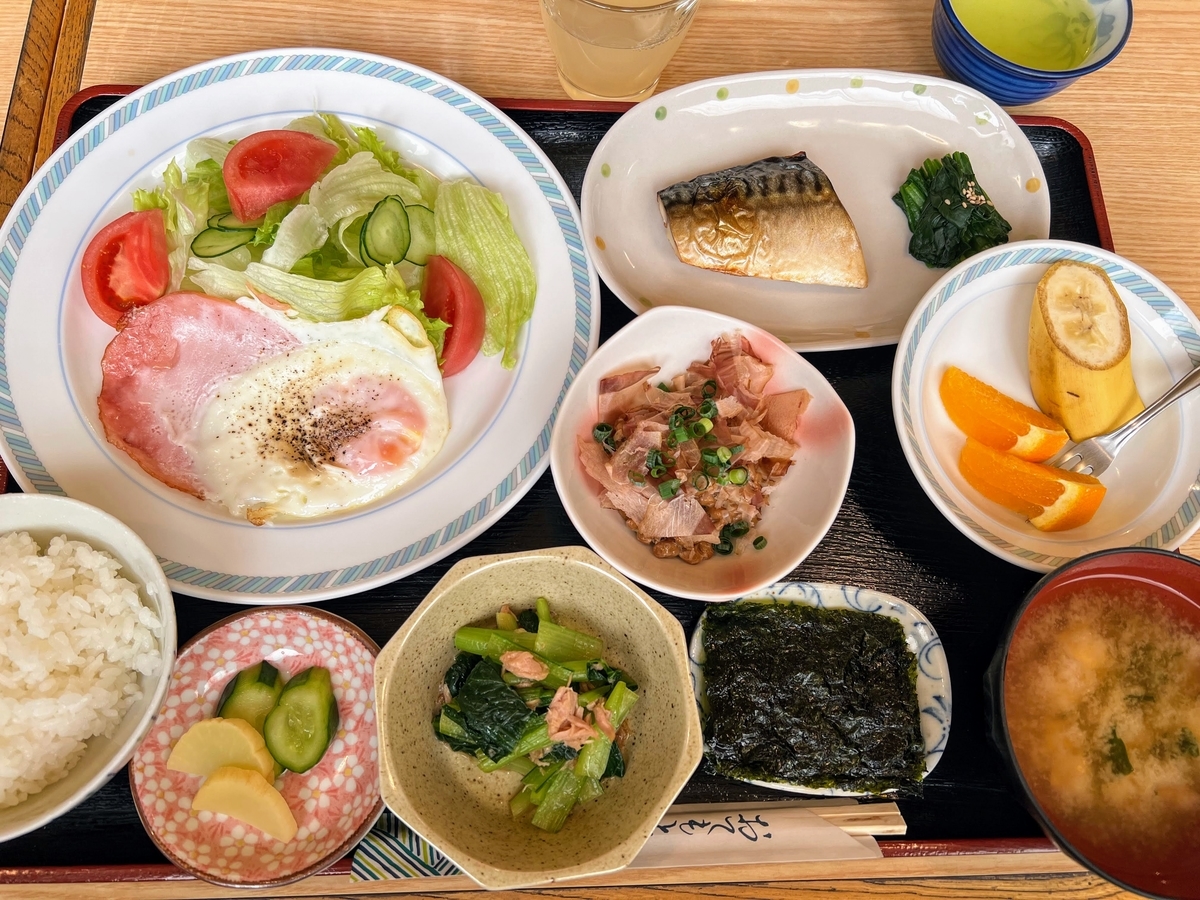ふっくら鯵の干物と、ネギトロをはじめおかずが少しずつたくさん並び、満足度の高い朝食でした。