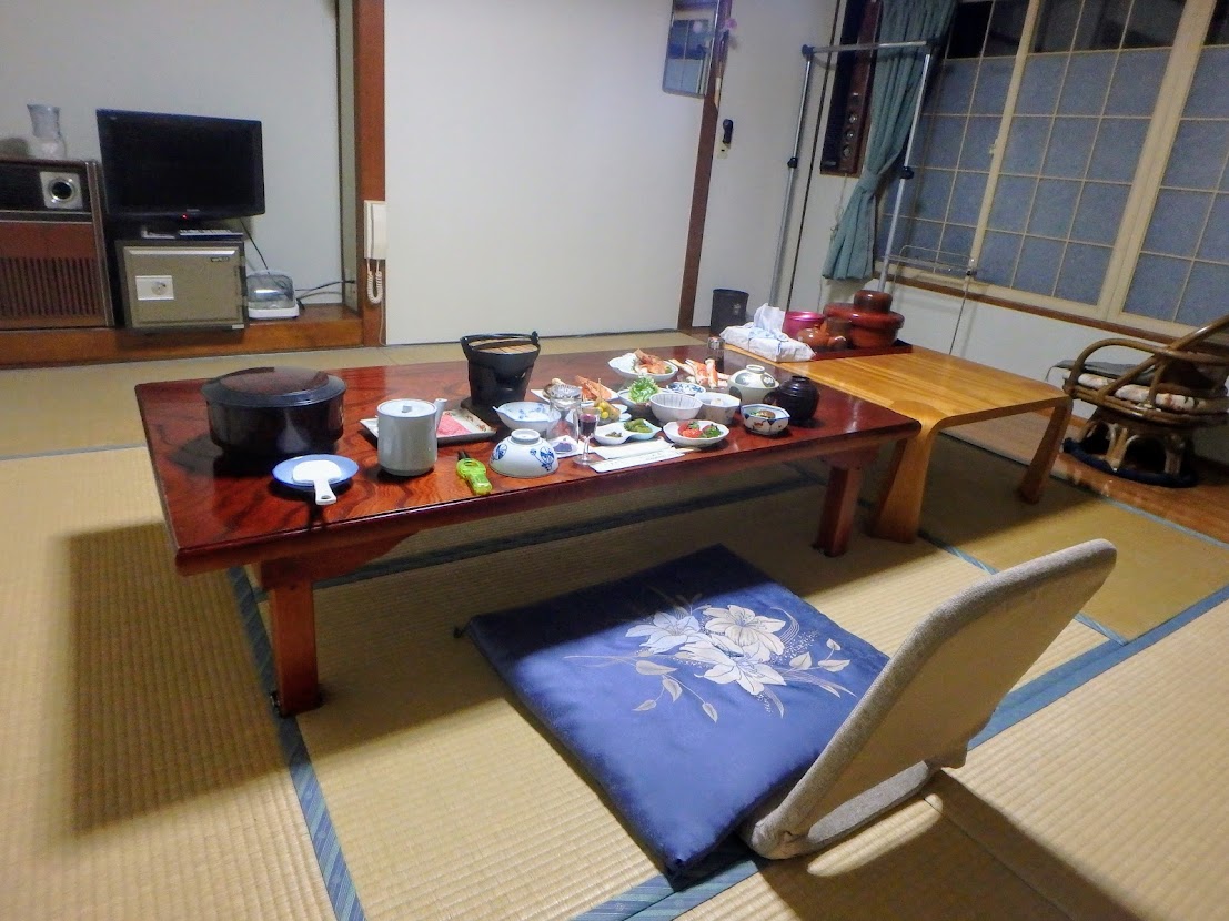 12畳のお部屋は調理場があると思われる棟から離れた棟にあり、真冬だったこともあって揚げ物の牡蠣フライはちょっと冷め気味でしたが、細かいことは気にしないようにしましょう。気になるなら泊まらないほうがいいかな……。