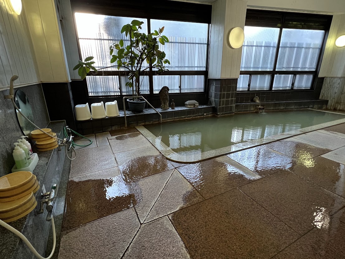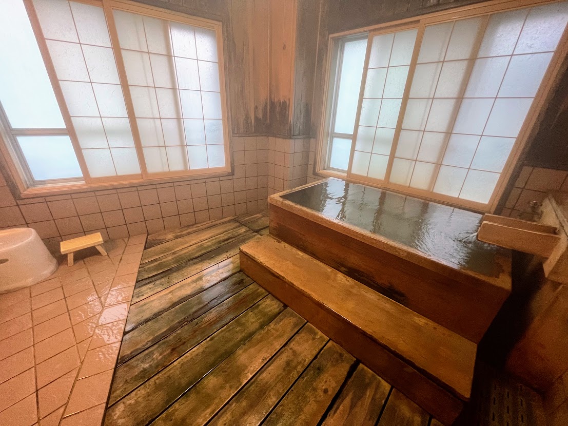 浴室は1階に男女別の内湯があり、きりっと熱い硫酸塩泉のお湯を楽しむことができます。浴室の利用可能時間はチェックインから24時までと、朝は5時からチェックアウトまで。