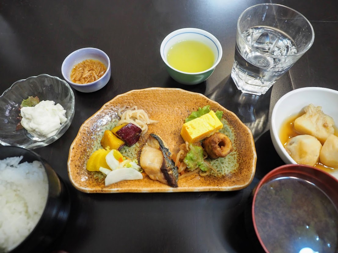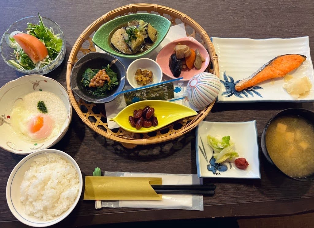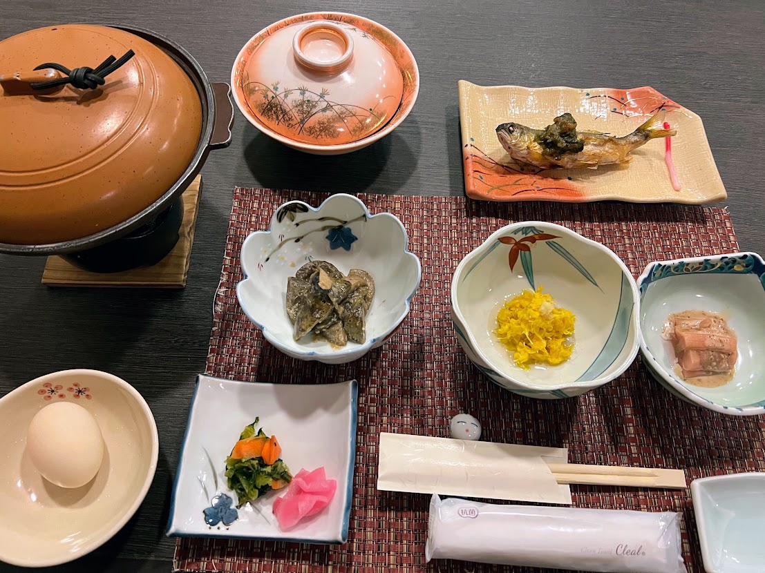 焼き魚に漬けもの、ほうれん草のお浸し、温泉卵、サラダなど基本的なおかずが並びます。デザートと思われる、甘く煮たりんごがおいしかったです。
