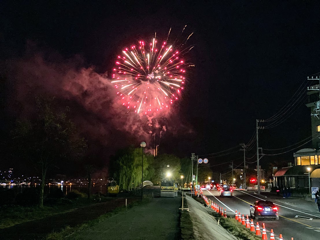 諏訪湖の目の前にある宿なので、玄関からちょっと出て道を渡っただけで、特等席で花火を見ることができました。