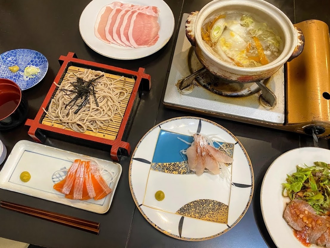 しっかり夕食プランでは「大鱒」と「シナノユキマス」と刺身が2種類も付き、肉料理もローストポークとしゃぶしゃぶの2種類。蕎麦もしっかり1人前ありました。