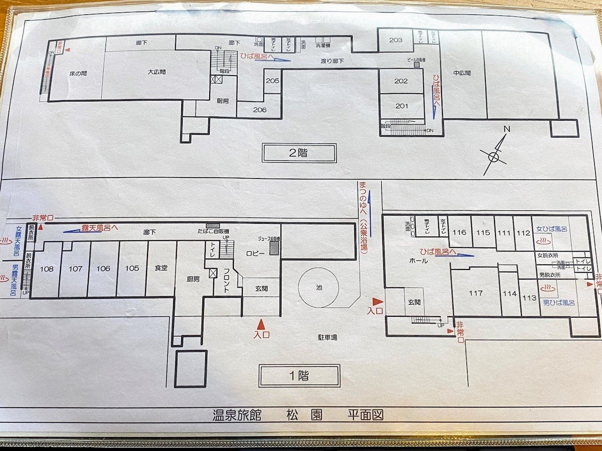 私が泊まったトイレ無しの洋室は館内図の右側の棟で「別館」と呼ばれていました。こちらには内湯の「ひば風呂」があります。