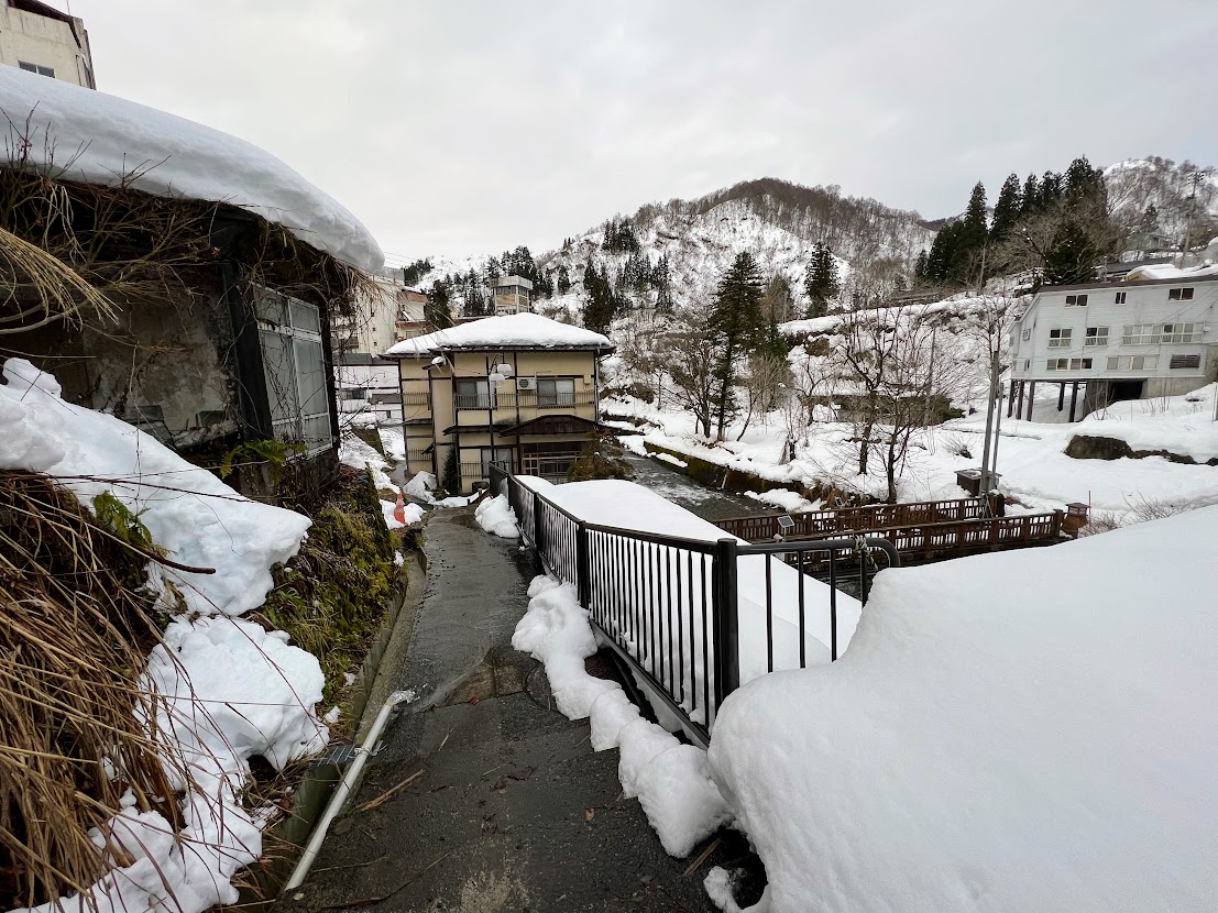 バス停から宿に向かう細い道の路肩には前日に降った雪が積もっていましたが、路面に積雪はほとんどありません。