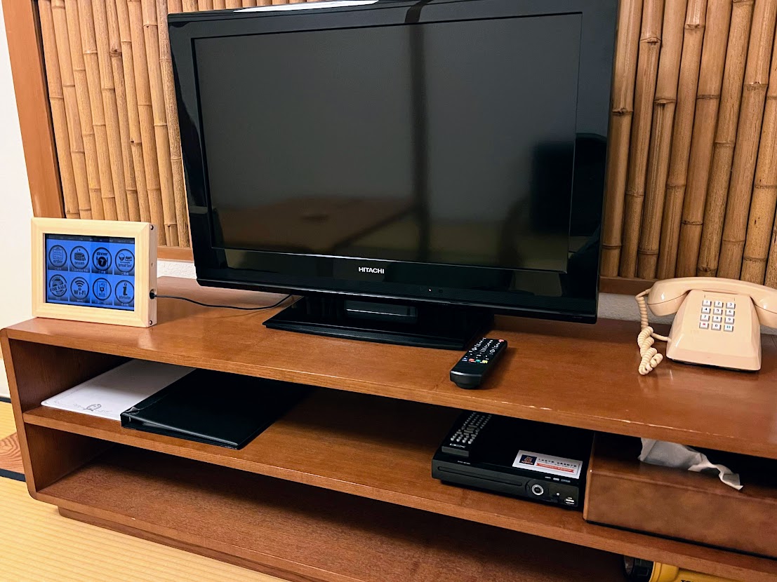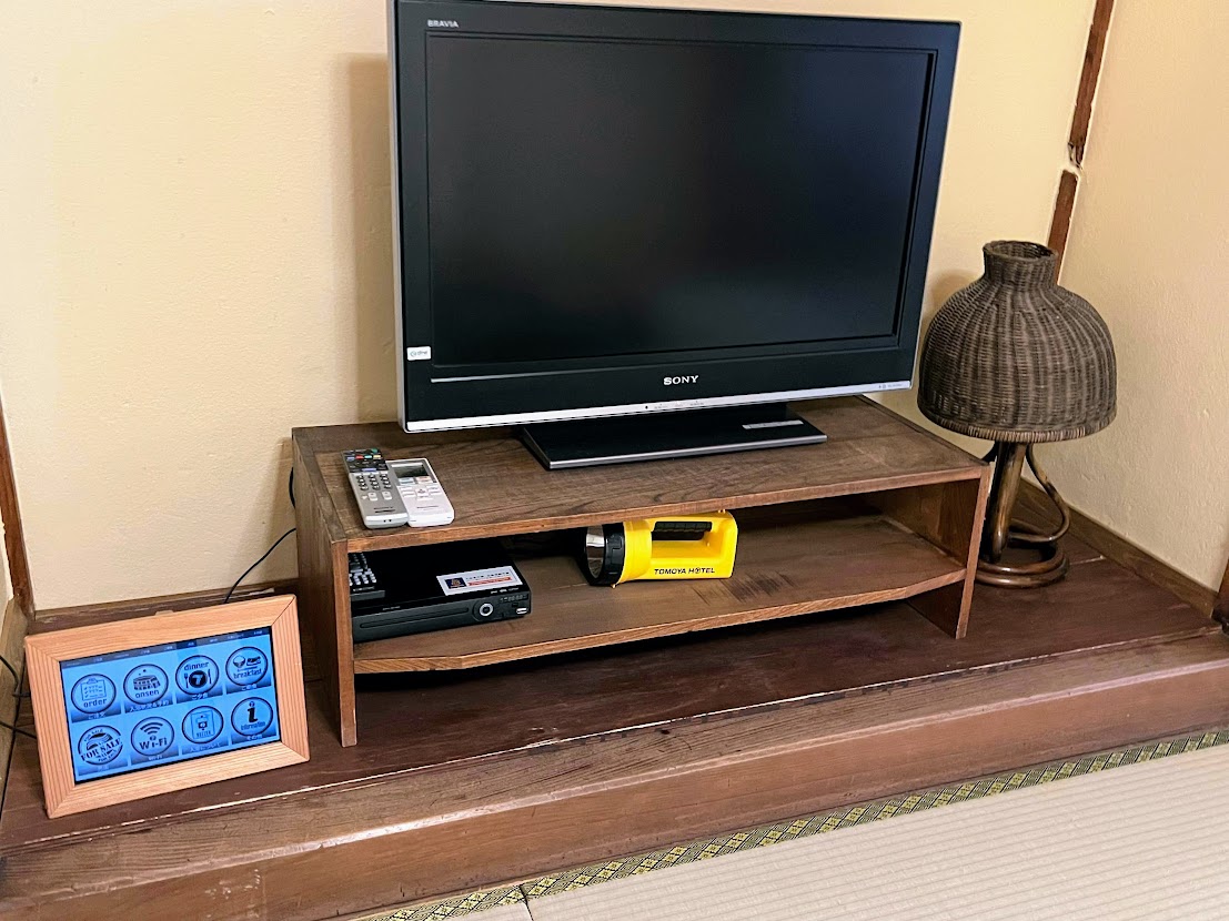 大きめの液晶テレビの橫には、ドリンクを注文したり浴室の空きを確認できるタブレットが置いてあります。
