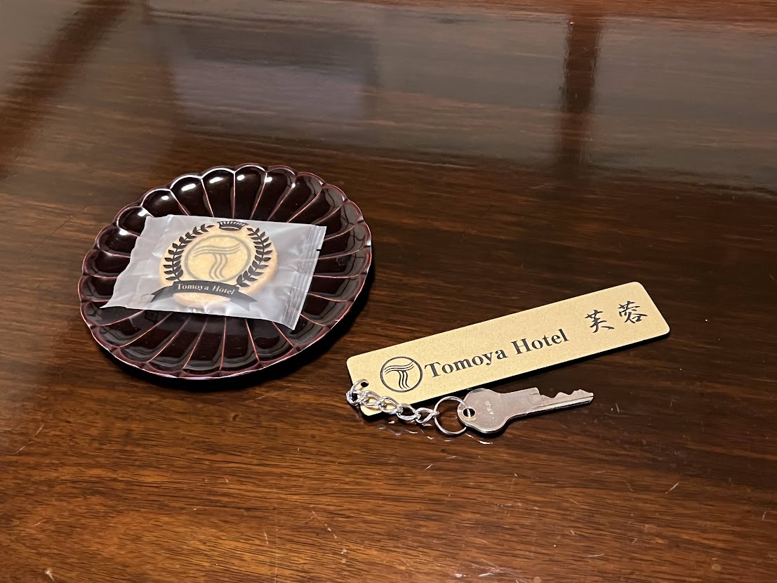 座卓の上に置いてあったお茶菓子は、パッケージに宿のロゴが印刷してあり、オリジナル商品のようです。