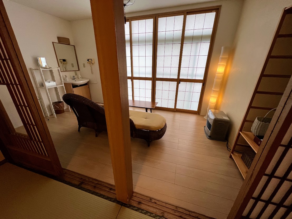 このお部屋はベッドルームではなく、布団は夕食後に和室に敷いていただくのですが、和室の奥にフローリングのスペースがあって、トイレ・洗面所やソファがあります。