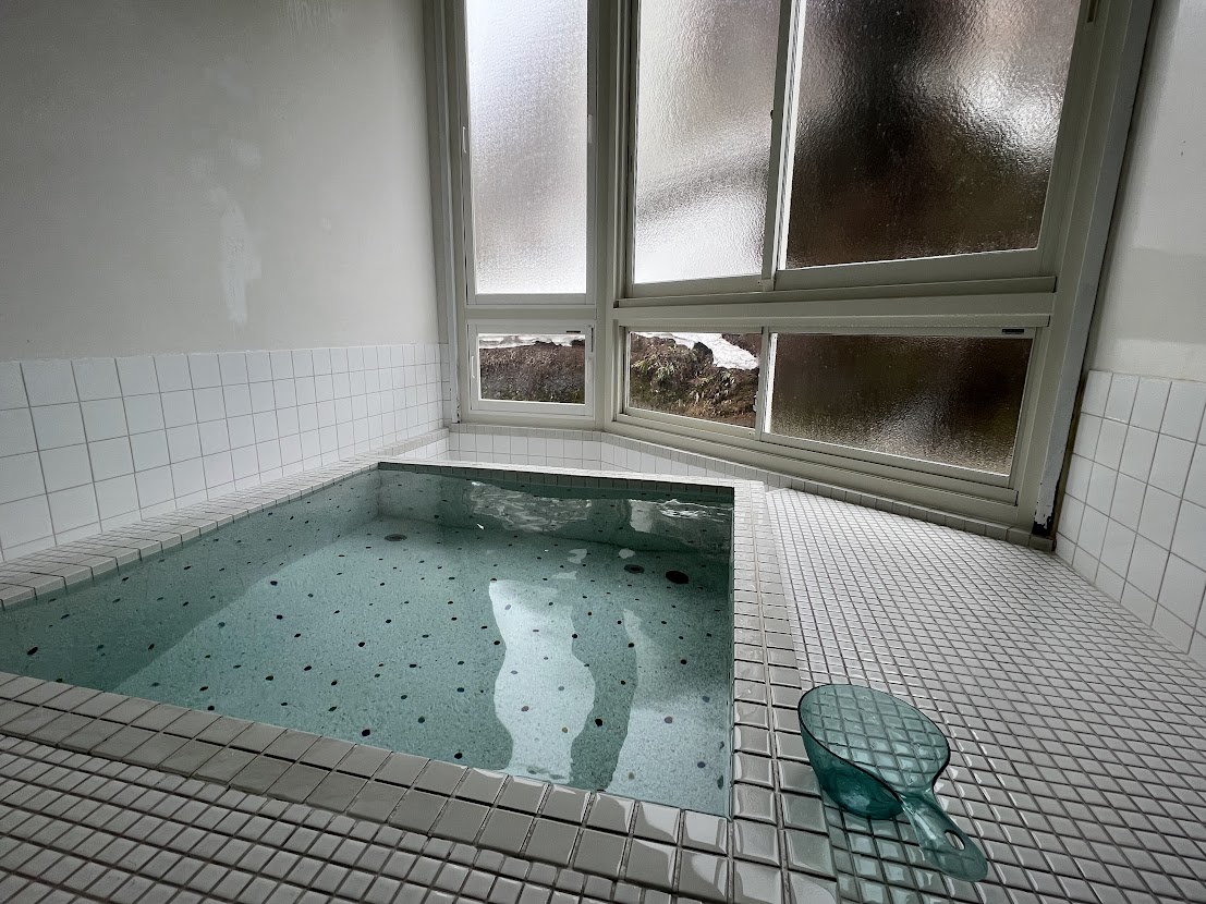 湯口が浴槽内にあるので湯面が波立たず水音もなく静か。水玉模様の特徴的なタイルを眺めつつゆったりと湯浴みを楽しみました。
