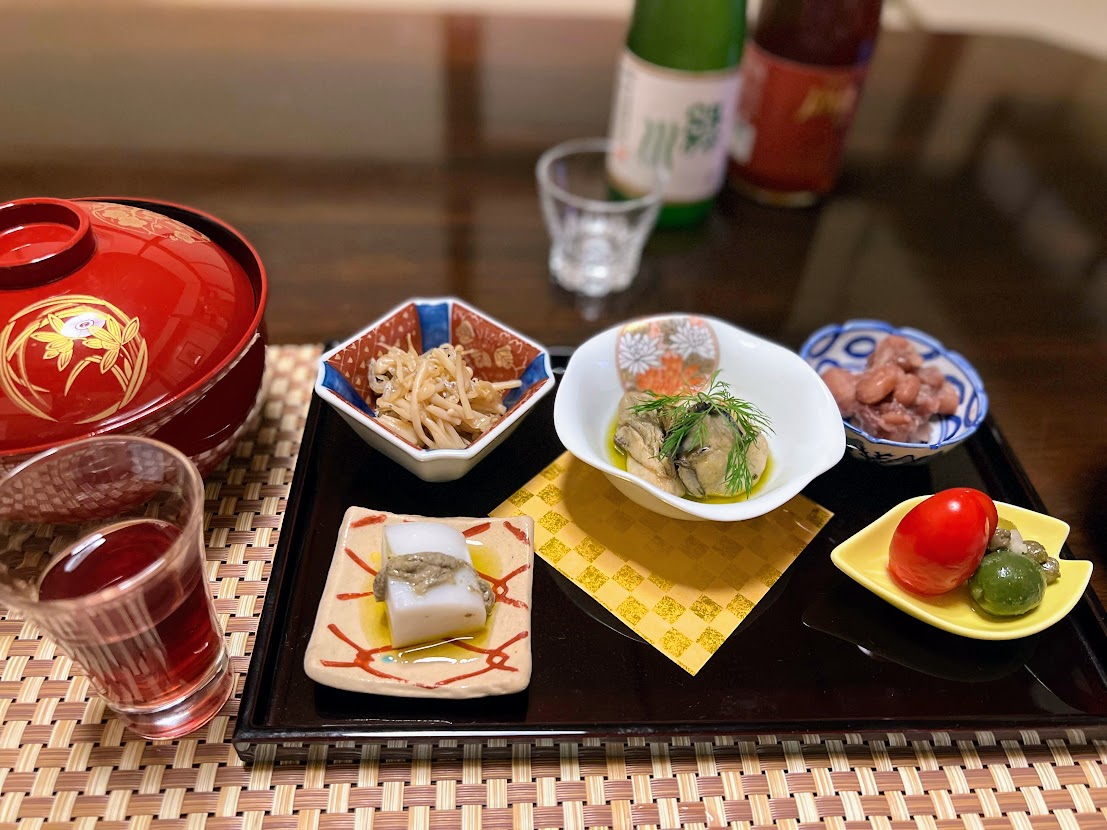 前菜は左上から時計回りに「じゃことえのきの柚子風味」「牡蠣のオイル漬け」「小豆と甘く煮た金時豆」「トマトとオリーブ」「かまぼことアンチョビ」です。